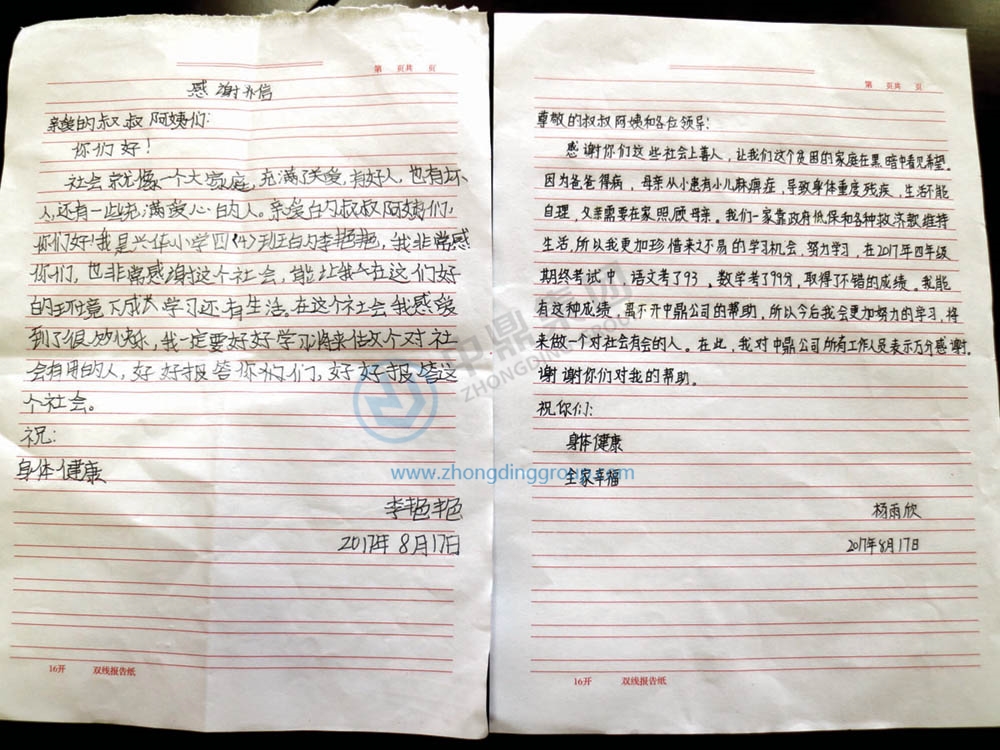 “尊敬的叔叔、阿姨,感謝你們這些社會(huì )上的善人,讓我們這個(gè)貧困的家庭在黑暗中看見(jiàn)希望……”。8月17日,中鼎精工廣德分公司收到兩封特別來(lái)信,這是由公司資助的兩名女孩送給“好心的叔叔阿姨”的感謝信。